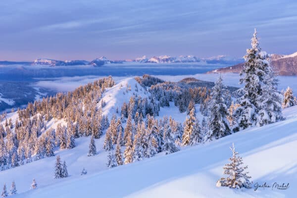 Depuis le massif de Belledonne, le regard s’évade sur les Bauges, baignées par la lumière de fin de journée. Les sapins enneigés et la mer de nuages composent une scène hivernale douce et silencieuse, entre profondeur et sérénité.