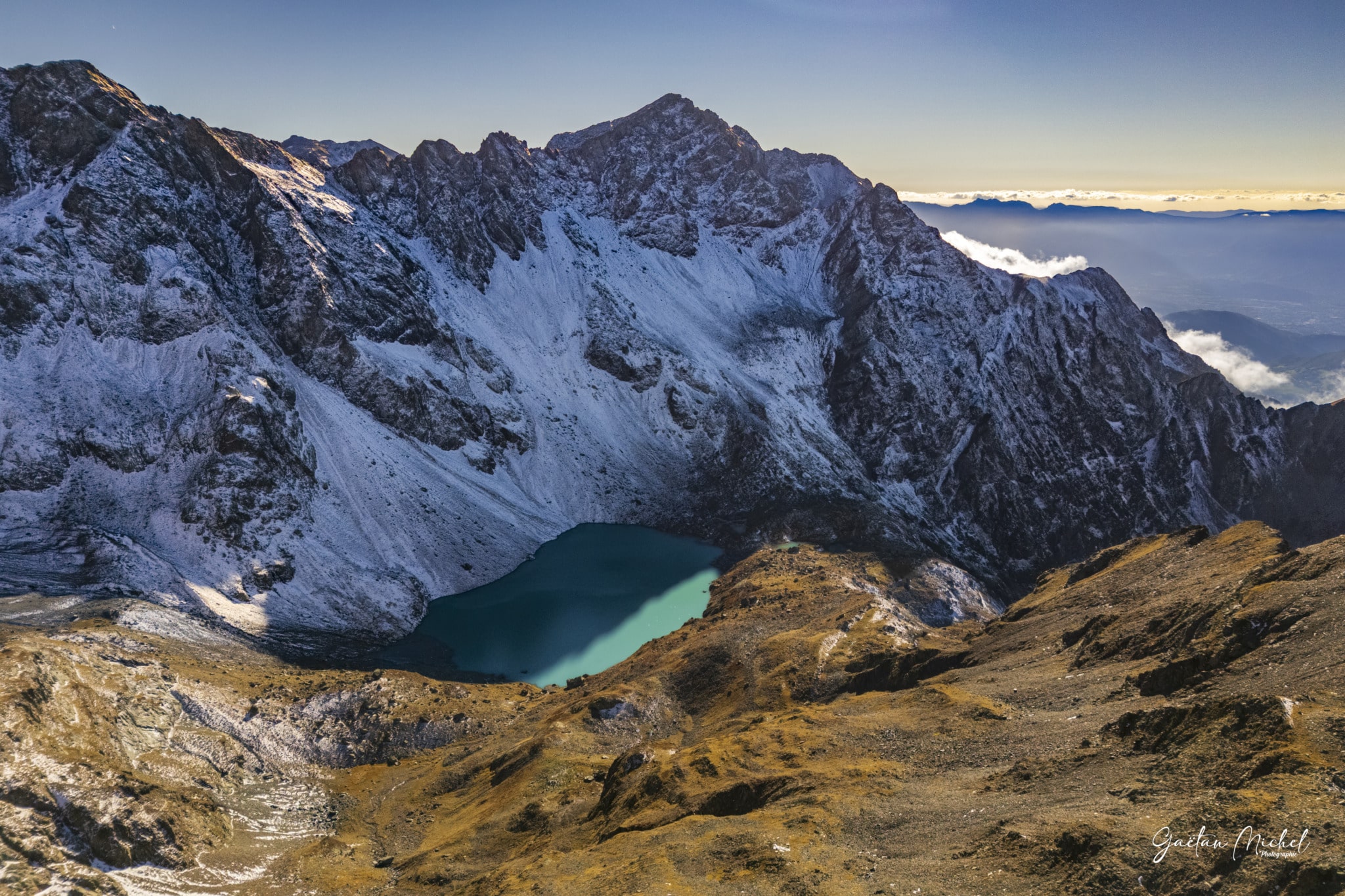 Niché au pied des parois abruptes du Grand Pic, le Lac Blanc de Belledonne dévoile ses eaux d’un bleu laiteux, nourries par les neiges éternelles. À près de 2 400 mètres d’altitude, il repose dans un cirque minéral où la lumière d’automne glisse sur les roches et révèle toute la puissance du massif de Belledonne.
