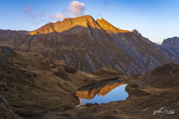 Au cœur du massif du Beaufortain, le lac d’Esola repose dans un silence presque irréel. À la tombée du jour, son eau calme devient le miroir de l’Aiguille de Terrassin, que les derniers rayons du soleil embrasent avant de disparaître derrière les crêtes.