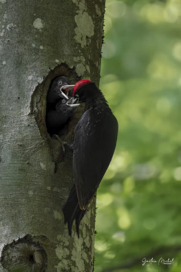 Instant de vie au coeur de la forêt, avec ce joli pic noir mâle qui nourrit ses deux petits dans leur nid que l’on appelle une loge, elle est creusée dans un tronc de hêtre. Le pic noir ( Dryocopus martius ) est le plus grand pic d’Europe.
